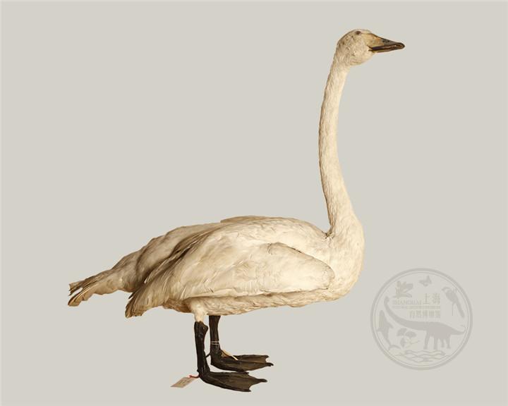 体型高大,约155 cm的白色天鹅。嘴黑,嘴基有大片黄色。黄色延至上喙侧缘成尖。游水时颈较疣鼻天鹅为直。亚成体羽色较疣鼻天鹅更为单调,嘴色亦淡。比小天鹅大许多。